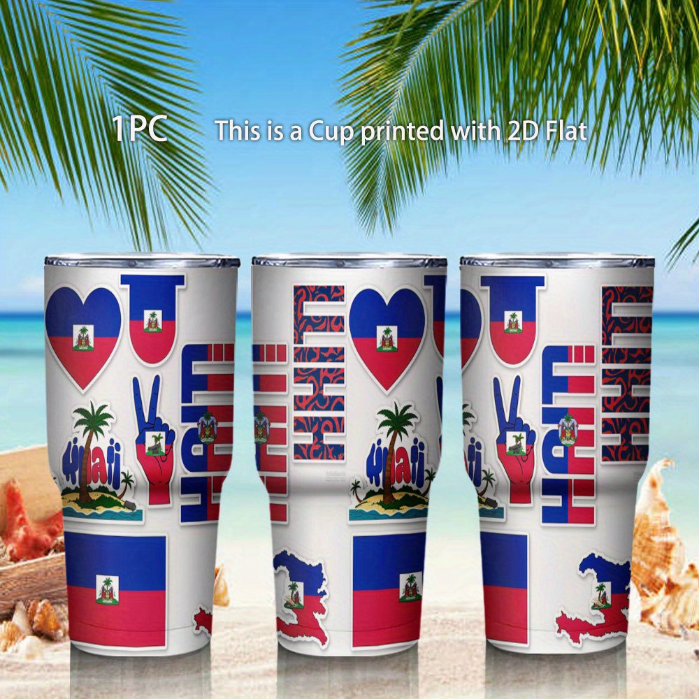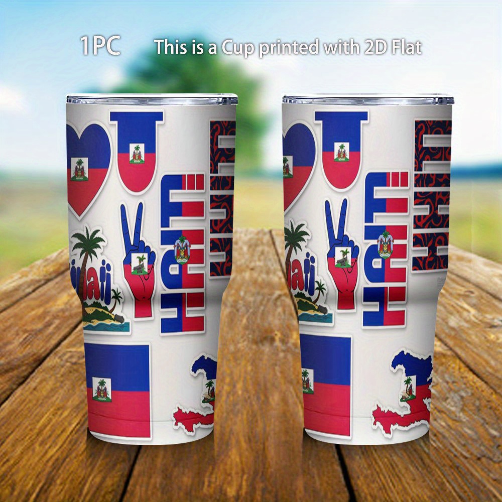 This 30oz travel mug features a Haiti flag heart and palm tree design. It uses double-wall vacuum insulation to keep your drinks at the right temperature for hours. Made from strong 304 stainless steel, it is built for the gym and outdoor trips.